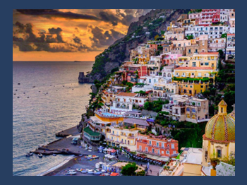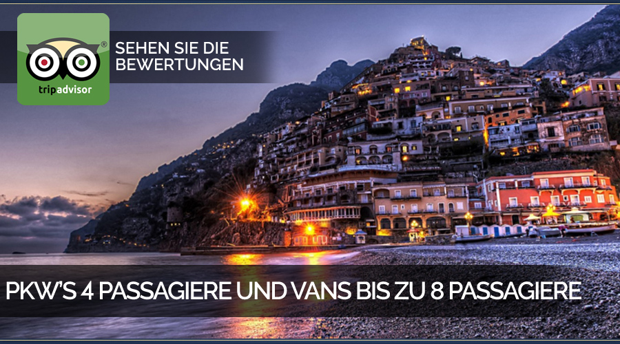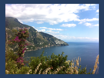 Zuerst Positano, ein Wasserfall bunter Haeuser, der vom Hang nach unten faellt, danach Sorrento der romantischen und wilden Kueste entlang, die eine Pflichtetappe bei einer Italien Reise ist.